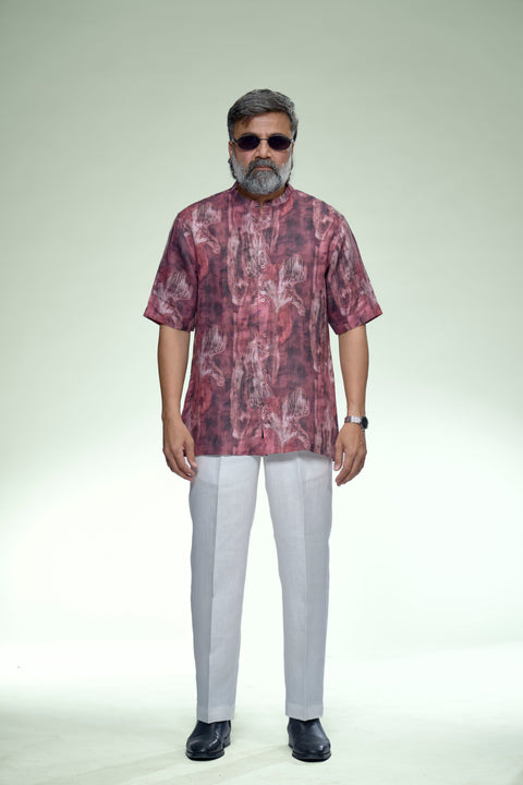 Scarlet Bloom Abstract Floral Pure Linen 3/4 Sleeve Kurta Style Shirt - AddysForMen®️