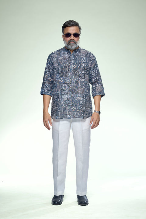 Indigo Nomad Mosaic Pure Linen 3/4 Sleeve Kurta Style Shirt - AddysForMen®️