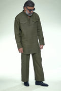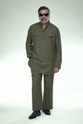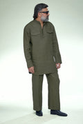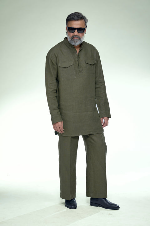 The Kurta features a streamlined Mandarin (band) collar and a concealed placket for a clean, uninterrupted front. The mid-length cut is perfectly balanced with matching tailored linen trousers, creating a monochromatic look that elongates the frame and exudes a sense of calm, sophisticated confidence.