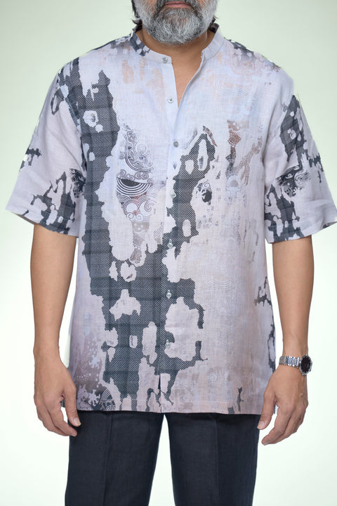 The standout feature is the bold, monochromatic digital print that flows across the front and sleeves. Combining pixelated textures, swirling line art, and organic shapes, the design creates a dynamic "mosaic" effect against the soft, off-white linen base. The clean mandarin collar and hidden placket ensure that the intricate artwork remains the focal point of the garment.